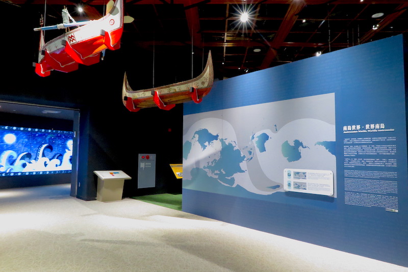 於史前館南島廳常設展入口,展出馬紹爾群島共和國贈送我國的舷外浮桿船,呼應該展「島是船,海是路」的海洋史觀。(國立臺灣史前文化博物館 提供)