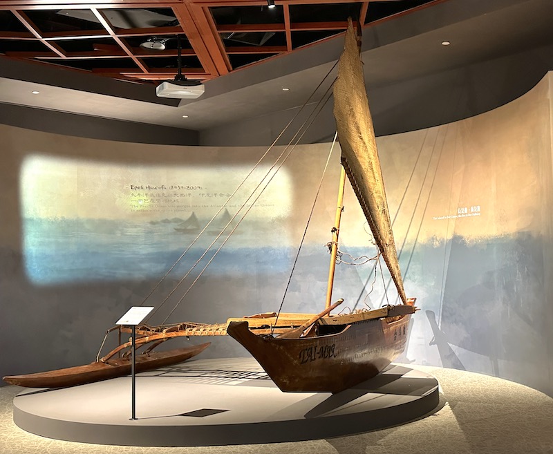 於史前館南島廳常設展入口,展出馬紹爾群島共和國贈送我國的舷外浮桿船,呼應該展「島是船,海是路」的海洋史觀。(國立臺灣史前文化博物館 提供)