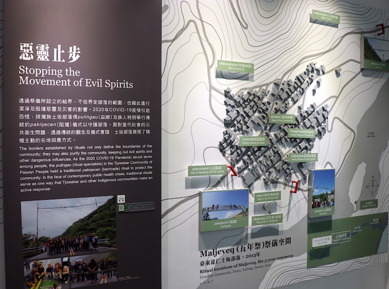 例如談及邊界此一概念在南島族群場域中所顯現的變動性時,該展覽運用排灣族土坂部落的例證,闡述著排灣族土坂部落的pulingau(巫師)及族人,在2020年COVID-19疫情期間,藉由舉行pakingecen(阻擋)儀式守護部落,以此展現該部落「面對當代社會的公共衛生問題,透過傳統的觀念及儀式實踐,呈現積極主動的在地回應方式(國立臺灣史前文化博物館,2023b)」,至此,邊界此一概念中所蘊含的族群主體性與能動性,不僅跨越了傳統與當代的邊界,也促使連接傳承過去與對接未來的界線,具備了相輔相成而非涇渭分明的特徵。