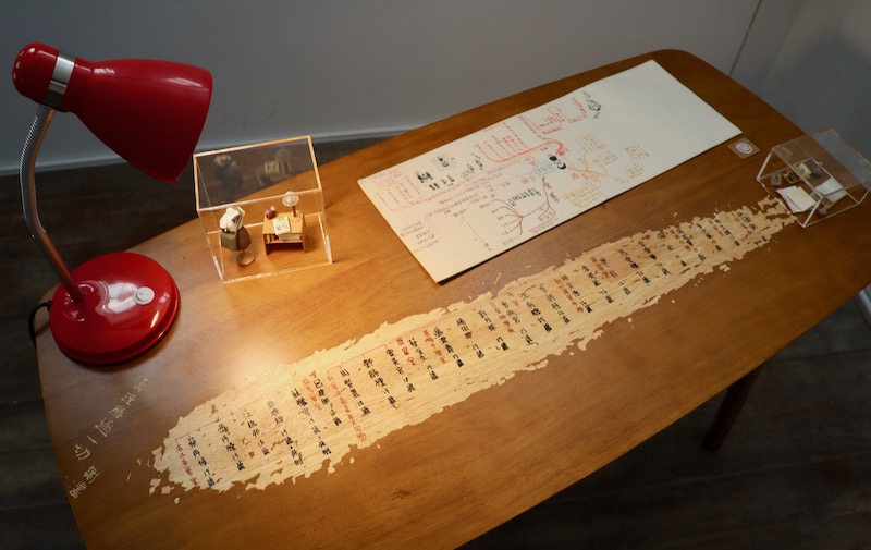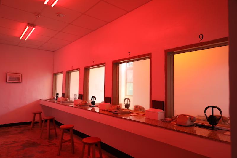 前往八卦樓展區途中,放封區【註釋2】鋪著片片印著白色方塊輪廓的賽璐璐片,方塊實為檔案上受難者死亡前相片被覆蓋的輪廓,張卉欣以《在最後一張照片之後》紀念那些被迫害的生命。當進到八卦樓,悶熱潮濕的氣味撲鼻而來,狹小幽暗的監禁室,陳列26歲的高草在槍決前,寫下「中華民國萬歲」的血書,廊道印著「誰是自由的、誰擁有人權、誰是無辜的」標語,吳瑪悧作品《我是高草》的空間氛圍與作品意涵,均使觀者反思自由意識的珍貴。