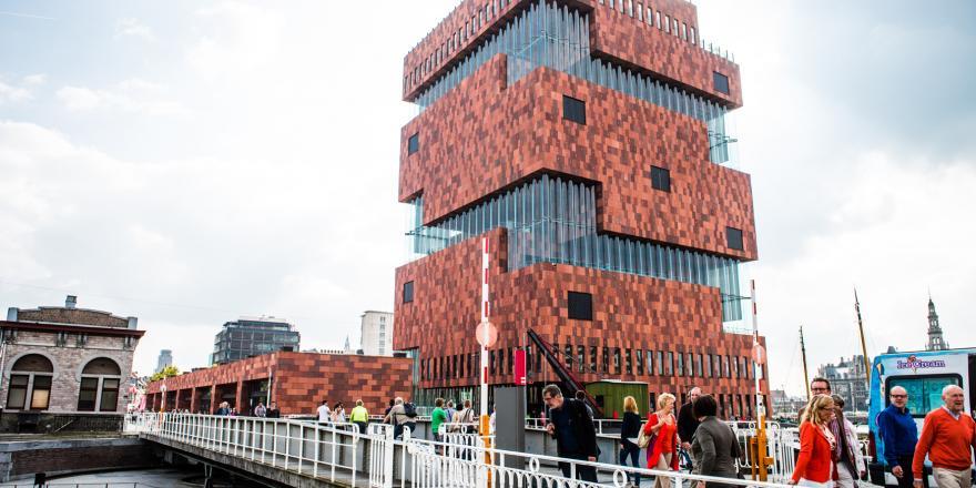 比利時河畔博物館座落於安特衛普,這座港口城市數百年來航運發達,因而從歐洲、非洲、美洲、亞洲及大洋洲運來大量物件。博物館收攬四間館舍1862年起的典藏品【註釋1】,並於2011年開館。穿梭於十層樓高的玻璃建築裡,觀眾彷彿隨著河水看著城市的歷史在眼前流動,使我們探問這座城市與國家殖民與被殖民的過往,並以多元視角觀看城市與自身、與世界的連結。