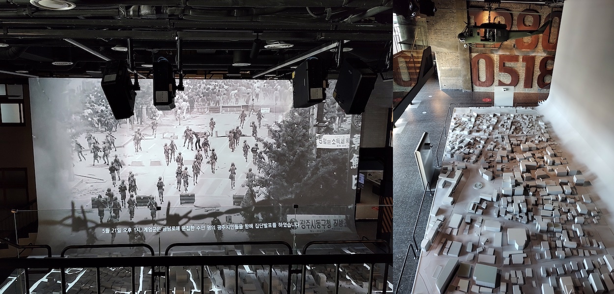該館導覽從一個子彈模型裝置開始,當觀眾穿過寬敞且昏暗的走廊時,可見設置於天花板的彈道模型裝置從頭頂略過,提醒我們這座建築物是光州事件的見證者。一旁的螢幕則播放著紀錄光州事件的黑白影片,畫面中直升機朝向觀眾開火,營造出極度可怕及不安的氛圍。