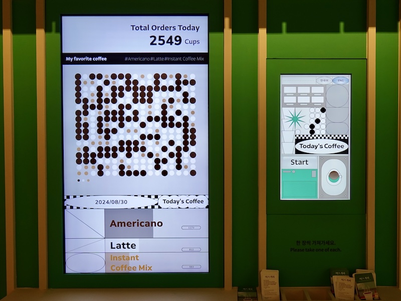 進入展廳,映入眼簾的互動裝置詢問觀眾:「今天你想來杯什麼樣的咖啡?」,彷彿走進咖啡廳準備點餐,觀眾可選擇喜好咖啡,也能從中了解當日其他觀眾的口味偏好。並可親自挑選一張咖啡音樂小卡。
