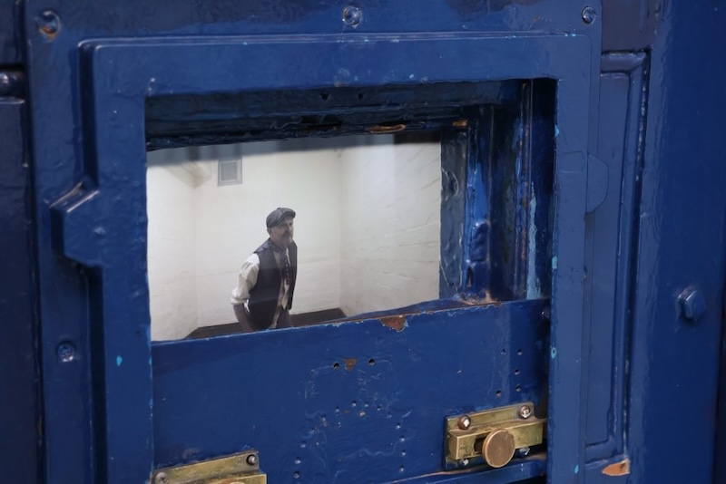 牢房監視孔影像裝置,影片中由演員扮演的囚犯模擬牢房生活,觀眾藉此可體驗監視囚犯生活的視角。(© West Midlands Police Museum)