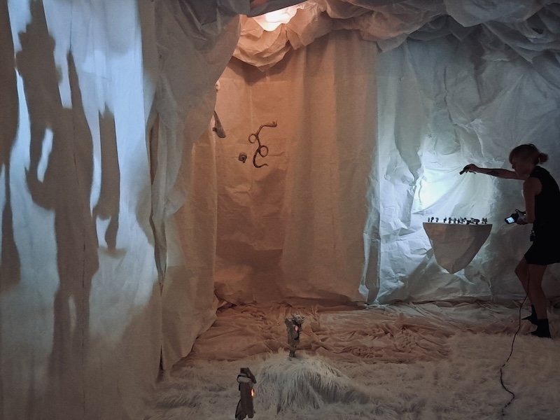 另外,適合成人的「POP-UP 期間限定」展演活動,則邀請德國藝術家Karla Kracht現地創作,她將展區打造成純白的考古洞穴劇場,舞台可見漫畫風格的賽伯格戲偶(comic-like cyborg figures)結合物件、聲光裝置以及即時投影的方式,呈現迥異於傳統偶戲的表演形式。