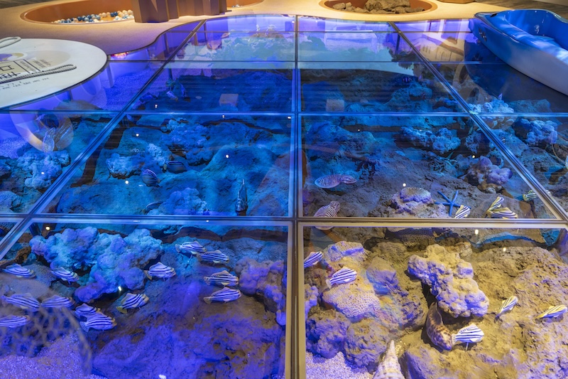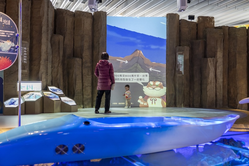 值得關注的是,展覽也重視永續發展議題,包含垃圾污染及海洋保育行動。展區中以廢棄瓶罐與漁網覆蓋魚群,模擬海洋污染的場景,促使觀眾進一步反思海洋廢物所造成的生態影響。此單元勾勒出未來世代所面臨的挑戰:共同守護家園的省思,生長在這塊土地的每個人,都肩負守護環境的重要責任。