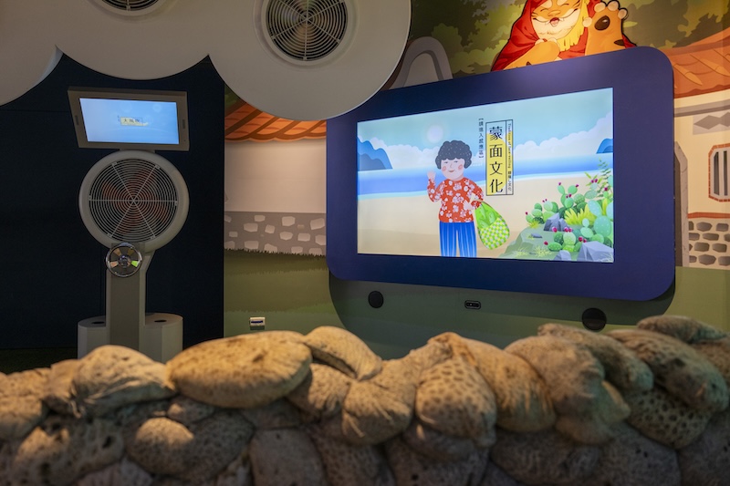 此外,展覽也運用AR感應設計使觀眾能夠體驗地方生業,如「海菜採集」與「蔬果農耕」,觀眾可透過螢幕扮演澎湖「蒙面」人物,認識由季風、豔陽交替下為遮陽、擋風發展而來的方巾「蒙面」文化,也能透過遊戲親自感受農漁勞務的日常。例如,站在感應區揮動手部,在有限時間內完成撈海菜的任務。