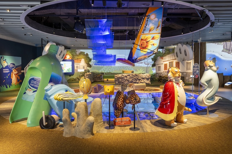 值得關注的是,展覽也重視永續發展議題,包含垃圾污染及海洋保育行動。展區中以廢棄瓶罐與漁網覆蓋魚群,模擬海洋污染的場景,促使觀眾進一步反思海洋廢物所造成的生態影響。此單元勾勒出未來世代所面臨的挑戰:共同守護家園的省思,生長在這塊土地的每個人,都肩負守護環境的重要責任。