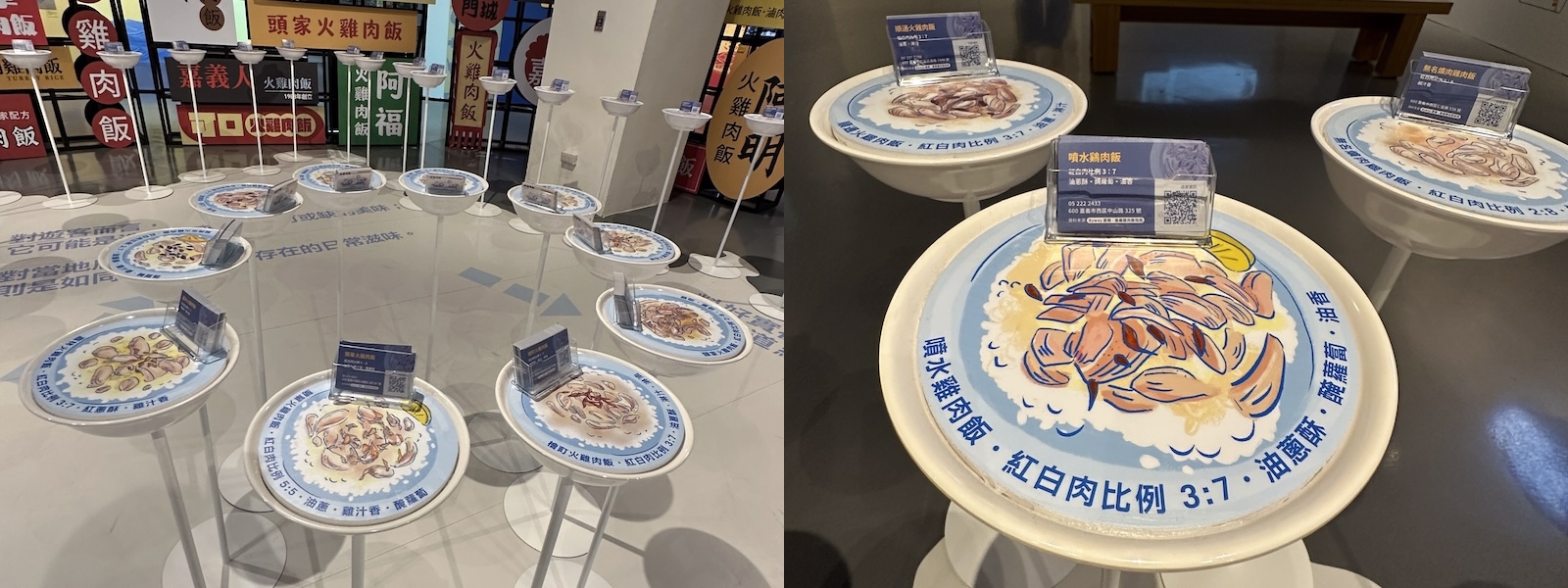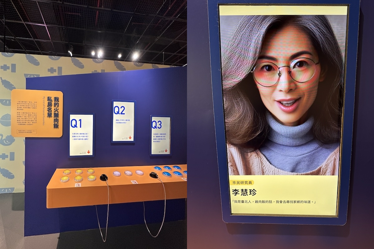 左圖:來自不同店家的火雞肉飯介紹,每碗飯連結一家店,為觀眾提供探索「火雞肉飯」的美食線索。/右圖:插圖可見不同店家的配方特色。(陳佩歆 攝影)特展不僅呈現一道地方美食的發展軌跡,更深入挖掘背後的文化內涵與在地記憶。展覽尾聲,邀請觀眾從觀光的視角,認識飲食文化與塑造在地意識的歷程,試圖讓更多聲音可以在此對話。如「聊聊吧!我們心目中的火雞肉飯」結合問題與影音裝置,呈現大眾對火雞肉飯的多元觀點。