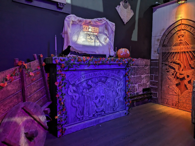 走進「診療巷」展區,映入眼簾的是一條中世紀時期幽暗的街道,逐項講述黑死病(the Black Death)的傳播與造成的傷害。黑死病是人類史上致死人數最多的流行病,14世紀出現於西西里後,隨著貿易路線而擴散至歐亞大陸各地區。