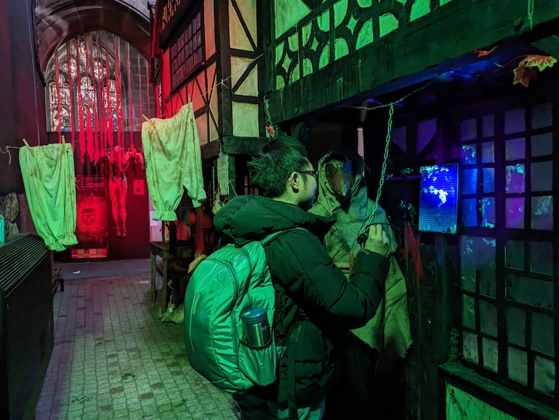該展區的展版被藏於四處,觀眾穿梭於街道之時,透過逐一揭開展版、窺視展示物件來挖掘黑死病橫行的黑暗過去。觀眾可拿著UV光筆在展間探照,找出肉眼不可見、以螢光顏料標示的細菌病原,例如血痕、髒污等痕跡,藉此強化觀眾與展示的互動,也幫助孩童想像病菌的傳播路徑。