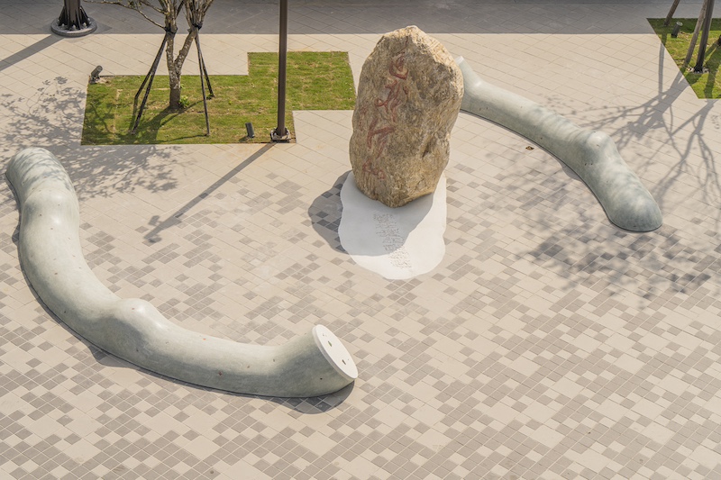 而藝術家劉千瑋回收再利用矗立在史博館庭園的「還我河山」石碑,並以其搭配廢棄建材打造的公共座椅製成作品《懷舊是危險的嗎—還我河山》。並轉化其代表戰後反共意識的意涵——「還我河山」何嘗不是一種對自然保護的叩問?為觀眾營造一個新的對話空間。