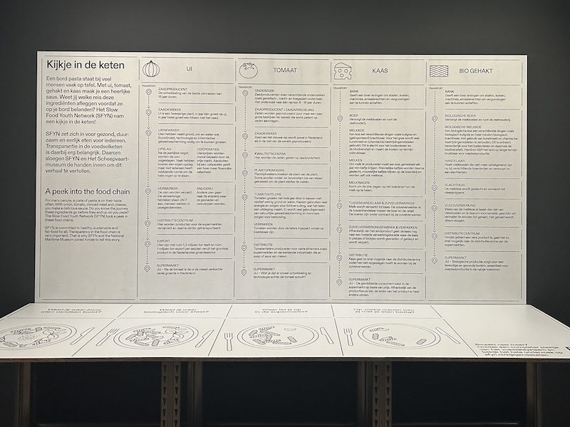 展覽可見荷蘭每年出口食物的統計,或站在體重計上,計算自己的體重是多少磅的美國牛肉;也與「慢食青年網絡」(Slow Food Youth Network)合作研究食物鏈,帶領觀眾透過插圖圖表認識常見於歐洲餐桌上的洋蔥、番茄、起司等食物背後的隱形旅程。
