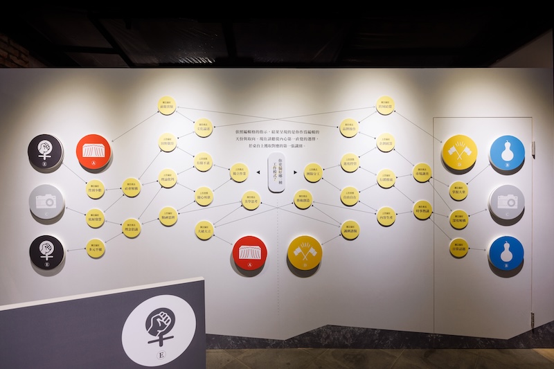 展覽首先邀請觀眾參與「選|編輯格」的測驗,雖似性格測驗遊戲,但實質上觀眾得到的測驗結果,更隱含著編輯者關注的課題與思維策略,藉此協助觀眾在觀展的過程中,摸索自身的編輯本色。