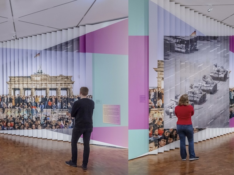 展覽採用倒敘手法,首先呈現了1989年東德的和平革命。此處的展示牆採用光柵立體印刷(lenticular printing)技術,依據觀看角度的不同,呈現出迥異的歷史畫面。當觀眾站在展示牆右側時,可以看到柏林圍牆倒塌時群眾歡慶的場景;而站在展示牆左側時,則會看到1989年天安門事件中一名男子英勇站在坦克前的畫面。這樣的並置手法,不僅對比了兩個共產主義政權在相似時期作出的不同決策,也連接到現今的政治形勢,使觀眾感受到歷史事件與當下的密切關聯。