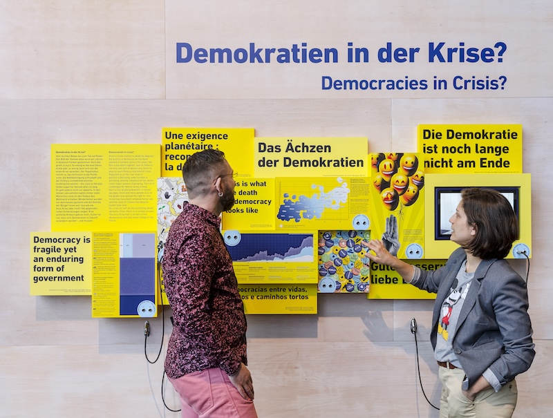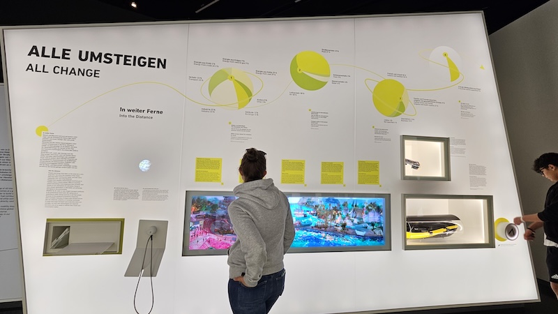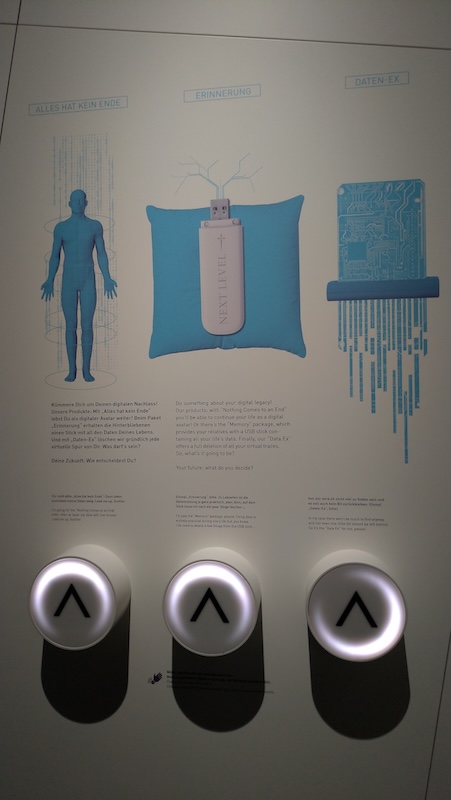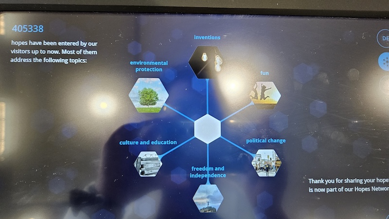如柏林未來館大廳的「未來願望」裝置,觀眾可在互動螢幕上輸入自己的未來願望,發送後系統會分析內容,將其連結至數個不同的領域,使觀眾發現更多相關的議題,以及看見自己的願望融入更大的網絡中。
