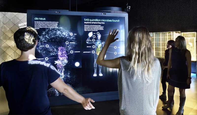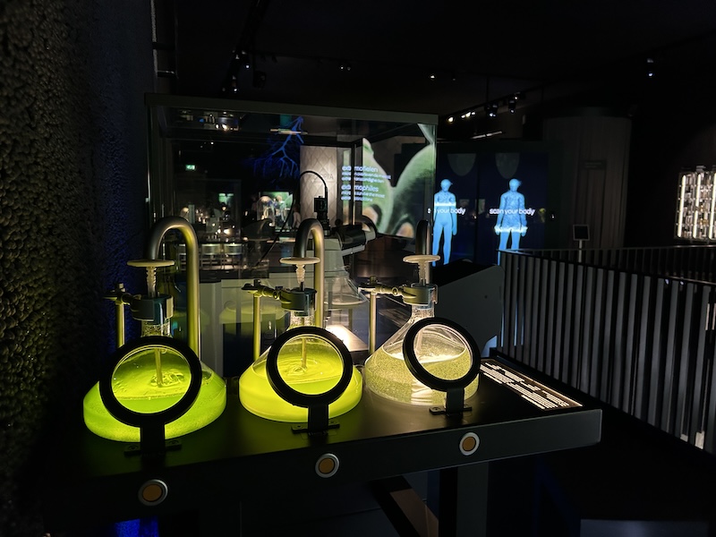 展覽設置了許多互動裝置,帶領觀眾理解生活與微生物間的緊密關係。例如,人體互動裝置,使用時會掃描觀眾的身體至螢幕中,接著畫面視角宛如進入人體內的縮小潛艇,使用者透過選取不同的人體部位,進入微生物的秘密棲息地,探索牠們如何在體內和體表與我們朝夕共處。