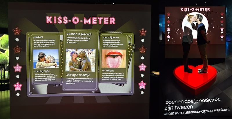 而親吻度量儀互動裝置(Kiss-o-Meter),則邀請觀眾踏上接吻台,觀眾透過「親吻」(或借位親吻)啟動投影感應裝置,以趣味的互動方式,引導觀眾從日常裡的社交互動,認識口腔中的微生物種類、親吻中微生物交換帶來的益處等知識。