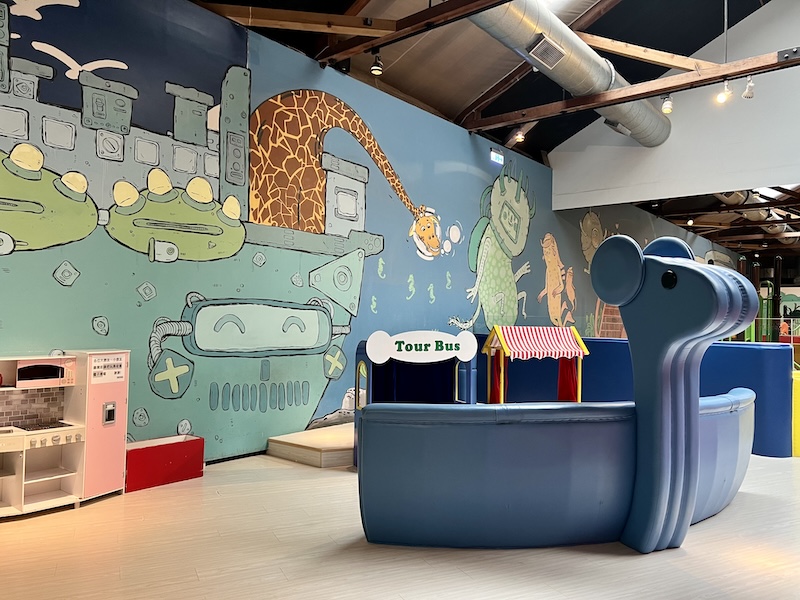 此外,園區也設有適合幼兒活動的兒童遊戲室,可提前至官網預約。空間繪滿由藝術家林佳勳、何宇森共同創作的大型壁畫,象徵兒童即將在草地、海洋、森林之間與街頭怪獸「蝸牛人」開啟的未知冒險。