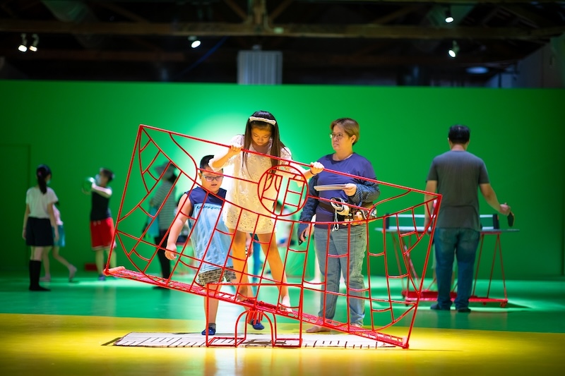 「藝術健身房」特展,作品發想自健身器材,使觀眾可在其中伸展筋骨與作品互動。(蕭壠文化園區 提供)