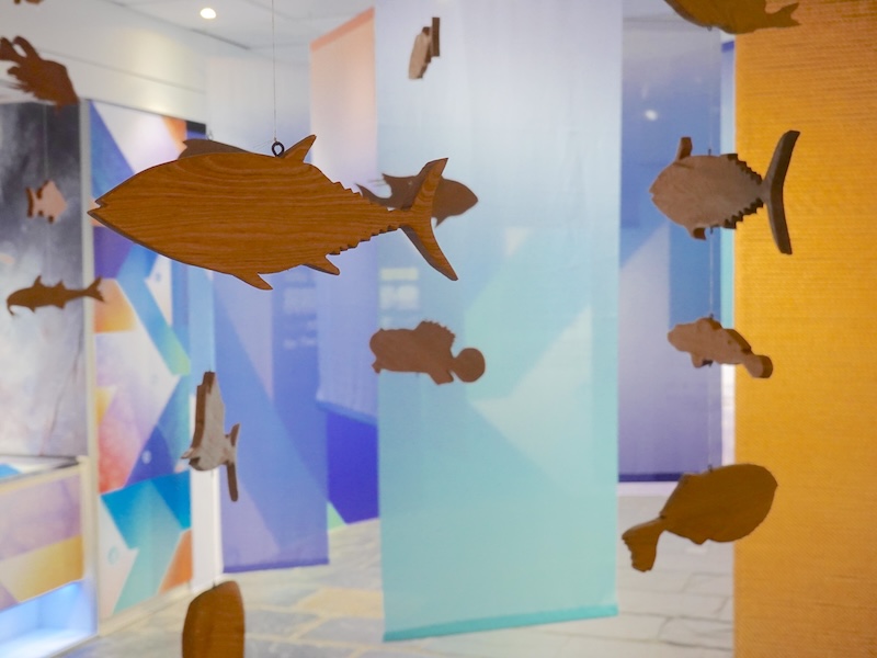 由王力之、潘明志創作的作品《adihay ko foting有很多魚》呼應展覽名稱,欲呈現部落族人生活中對於海洋的知識與技藝。(鄧皓勻 攝影)