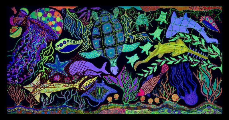 來自蓬普拉歐藝術文化中心,Christine Holroyd、Elliot Koonutta、Syd Bruce Shortjoe 和Romena Rose Edwards作品《保護我們的海洋II》(Protecting Our Ocean II)。(圖片提供:The National Museum of Australia)