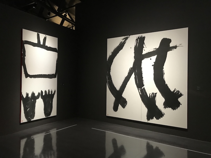 左起為朴元圭的作品《公正》和《協》,使用現代文字重新詮釋古代的金文,強調書法的繪畫性質。(許芮禘 攝影)
