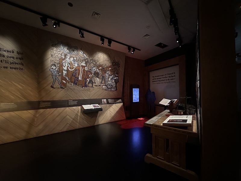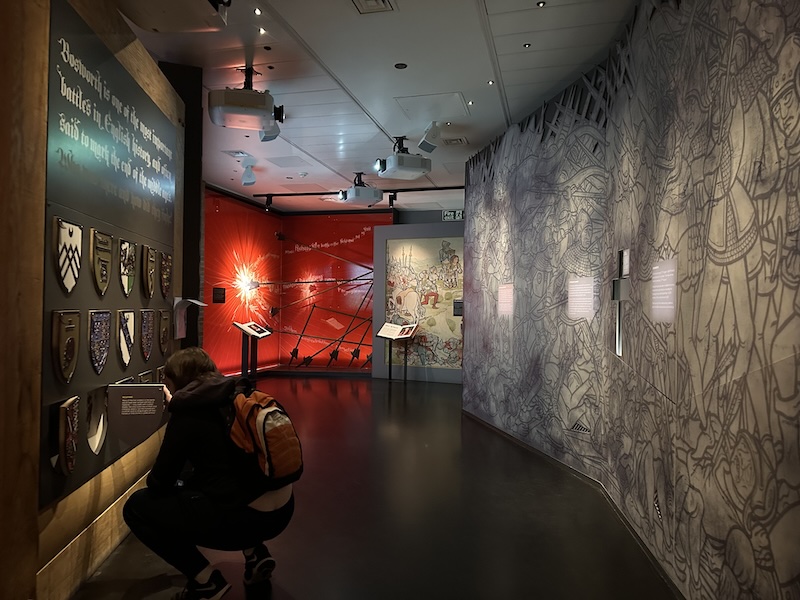 然而,國王的形象仍舊缺席,觀眾需要持續前行,才能逐漸建構出理查三世的樣貌。除了文物展示,展覽還有許多互動裝置,如家族徽章翻閱式展版,刻畫出各家族的勢力,協助觀眾了解博斯沃思之戰的參與者與其為何而戰。此展區也刻意以稍暗的色系與聚光燈,結合攤開書本為設計的解說牌,以及牆上中世紀手抄本元素的圖像與錄像,彷彿走入歷史戲劇中。