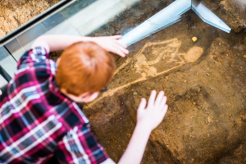 理查三世的考古現場,館方以骨架輪廓標示理查三世遺骸出土時躺臥的位置。(© King Richard III Visitor Centre)