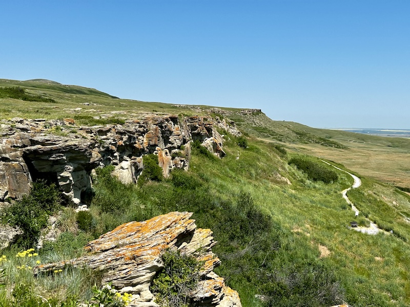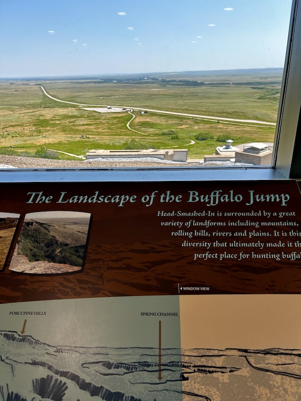 【註釋1】在狩獵時,獵人會從跳崖以西3公里的豪豬群山(Porcupine Hills)的草原出發,將野牛群趕往由數百個石頭標示的奔跑追逐小徑(Drive Lanes),最後驅趕野牛全速躍下懸崖。這些野牛的屍體便在附近的營地進行處理。