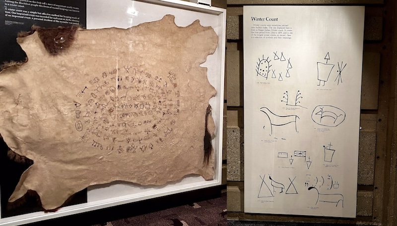 在黑腳族的傳統中,野牛不僅僅是生活物資的來源,更是他們的文化核心,這一點可見於「冬季計數」(Winter Count)牛皮。族人以特殊符號在野牛內皮上記錄部落重要事件。館內展示了迄今時間跨度最長的冬季計數牛皮之一,並輔以符號說明展版,使觀眾可以嘗試自己解讀「冬季計數」的故事。