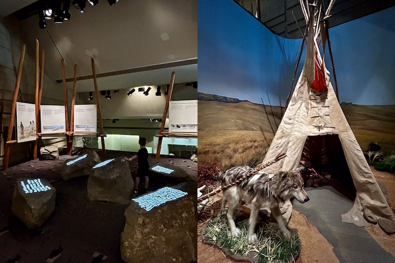 四樓展區設有黑腳族部落生活場景和互動裝置。而館舍五樓則與懸崖頂等高,觀眾可步行前往觀景台,親身體驗懸崖的尺寸與遼闊視角。據館方介紹,現今看到的野牛跳崖約為昔日規模的一半,由此可想像過去捕獵野牛的盛況。