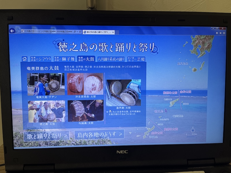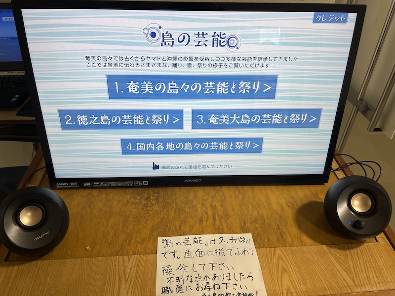 「觸摸觀看德之島的民俗藝能與祭典」(タッチパネルで見る徳之島の芸能と祭り)(展期至2025年3月31日)是由徳之島町郷土資料館、伊仙町歷史民俗資料館、天城町歷史文化產業科學資料中心,三間地方館與大阪國立民族學博物館合作的展示計畫【註釋1】。此計畫彙整了自2010年起德之島及其周邊奄美群島的民俗祭典與藝能影音資料,透過影像裝置,提供觀眾豐富的學術研究資源【註釋2】。並在三館同步展出,結合各館舍特色,呈現不同角度的文化樣貌。