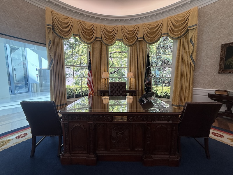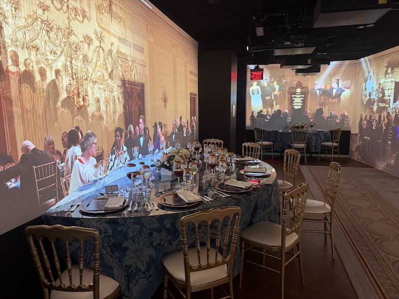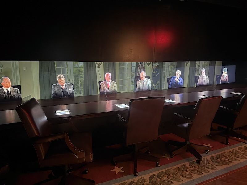 展廳「行動中的白宮」(The White House in Action),觀眾可坐在館方特別打造的餐席裝置體驗外交晚宴,欣賞表演、參與貴賓入席與總統入場的盛況。此外,該館最具代表性的橢圓形辦公室,則復刻現任總統拜登的辦公室裝飾佈置,帶領觀眾親身體驗總統的辦公日常。大選後則將隨新任總統調整展示,體現該館別出心裁、與時俱進的設計巧思。