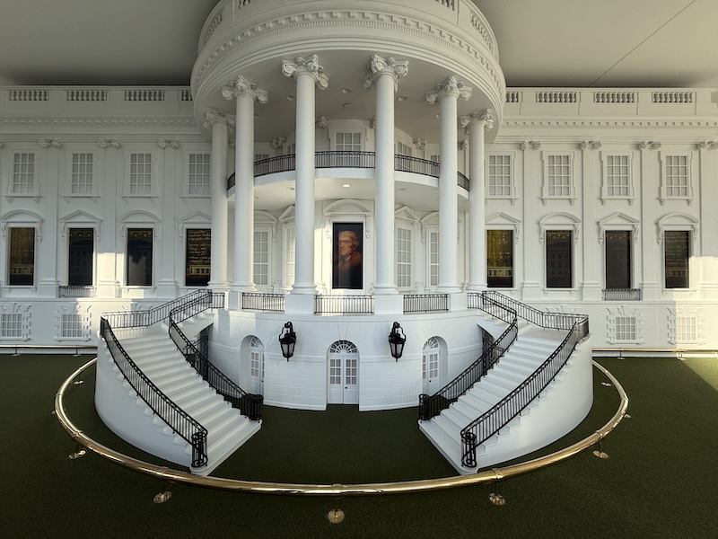 入口展區極具特色的等比例白宮南立面模型,結合音效、燈光和影片,講述白宮自1790年以來的建築故事。(何慕凡 攝影)