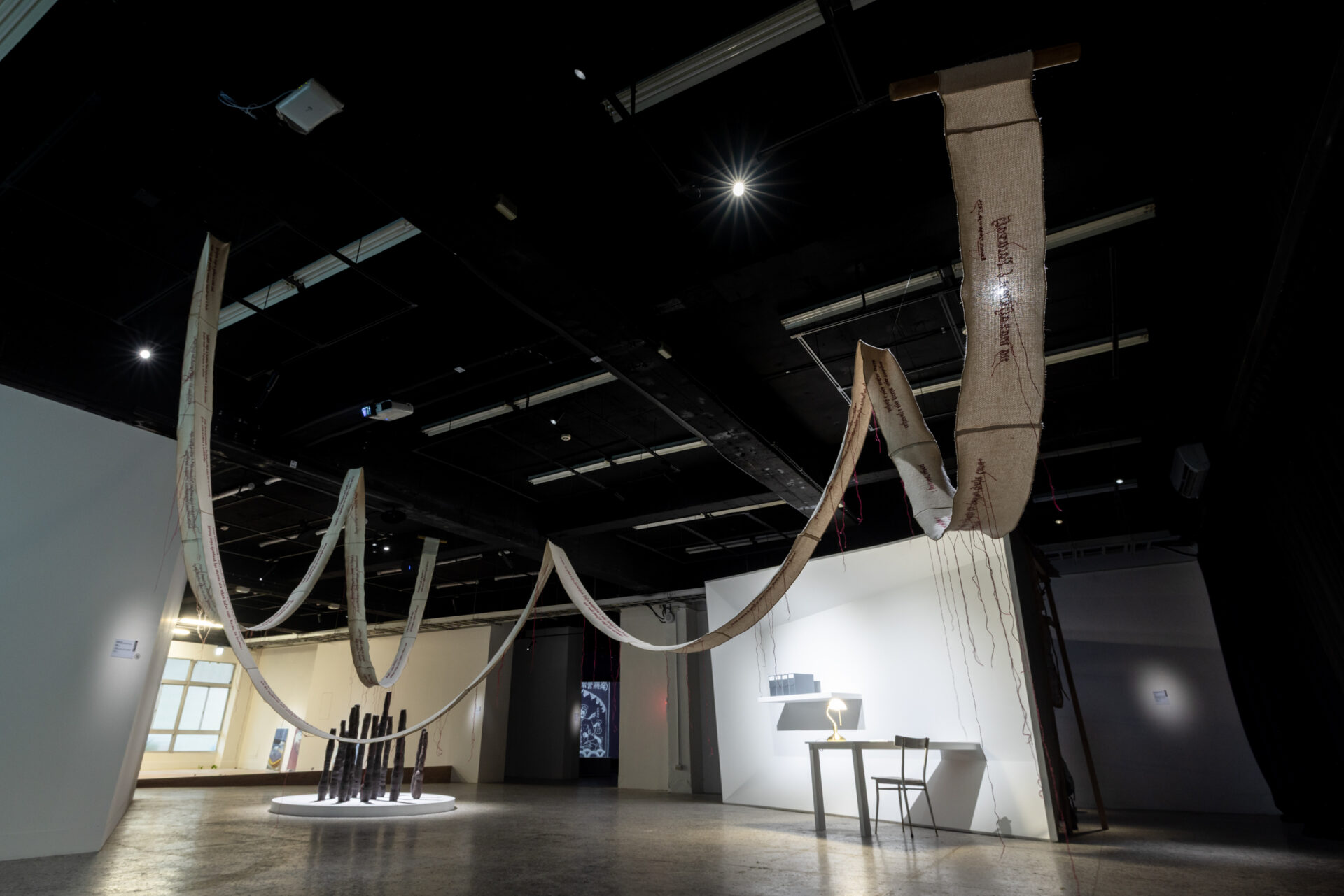 展覽也關注語言如何在歷史暴力與殖民結構中,成為權力的工具與記憶的載體。例如,張紋瑄《檔案太大無法放置在目的地檔案系統》便以綠島白恐記憶與韓戰期間釜山難民的創傷經驗為起點,透過設置實體檔案翻閱區與錄像裝置堆砌的大量資訊,展現記憶如何在累積中超載,並在無形中侵蝕、壓迫日常。而陳飛豪《男生徒》則爬梳日治時期臺韓書報與小說,選取3篇早期香港與朝鮮的醫學與文學文本,發展為6頻道錄像與1部長篇動畫作品,從中挖掘性別、語言與帝國結構下的情慾書寫與抵抗線索。