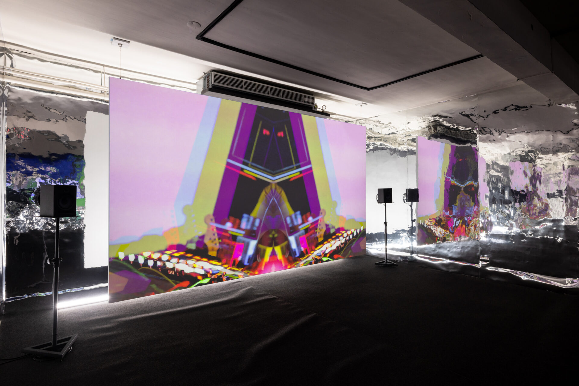 展覽也關注被壓抑或難以言說的當代情感與性別經驗。例如,曾建穎《愛情靈藥》以「和合二仙」【註釋2】為原型,描繪當代人際關係的依附、幻象與操控。色彩鮮明、造型誇張的畫面延續其一貫揭示暴力與虛無的繪畫語言,質疑關係中看似甜美實則不對等的權力結構。南韓藝術家鄭恩瑛與酷兒音樂家KIRARA合作的《消除噪音,消除身體》將展間打造如同夜店場景,透過藝術家口白與躁動狂放的電子音樂,讓聲音成為跨性別群體解放身體焦慮的象徵。