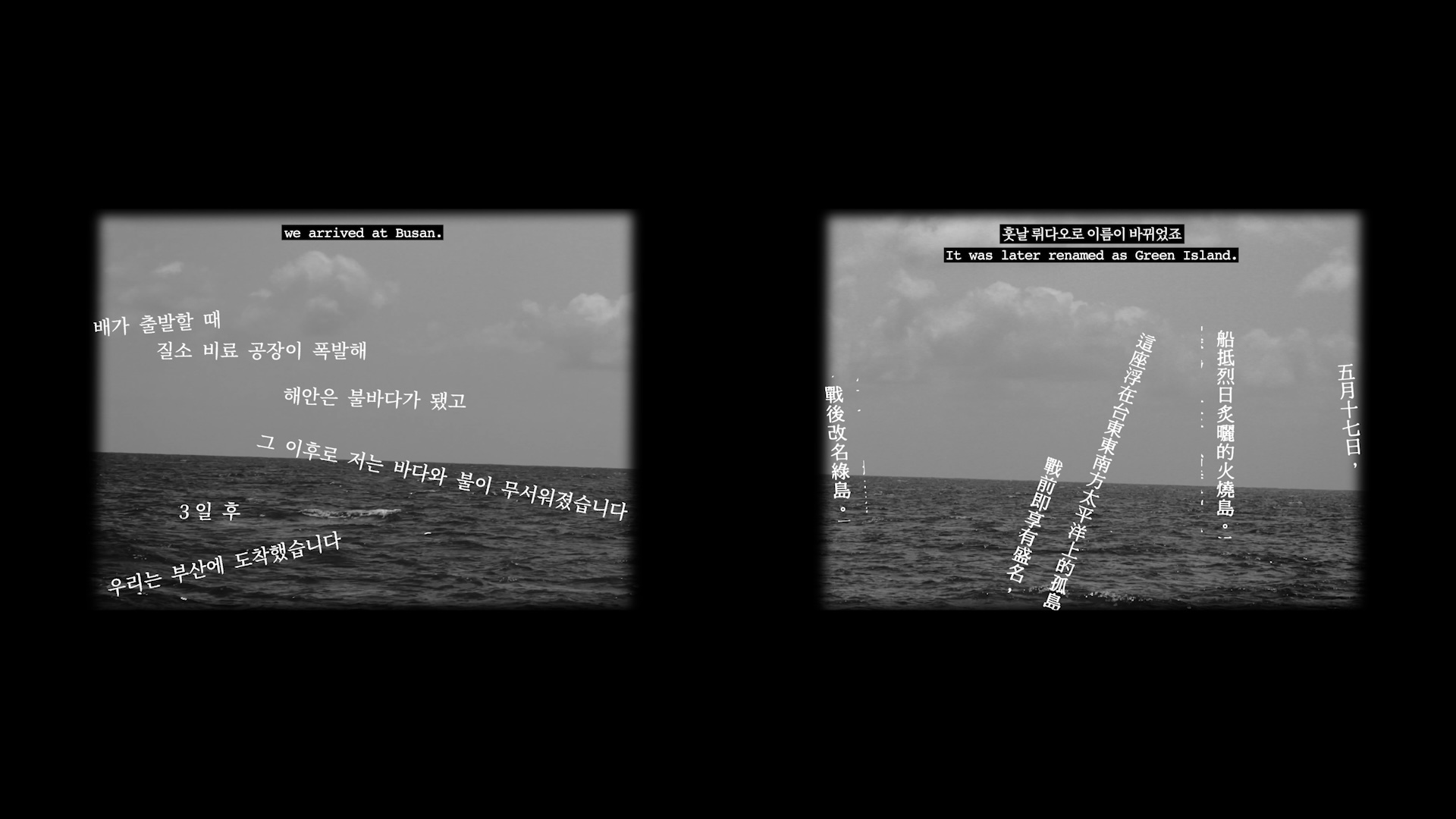 展覽尾聲由米尼亞・碧亞比亞尼的《在夜裡的無盡凝視》作結,作品以破碎影像與斷裂聲響,回應瓜地洛普的殖民歷史。畫面中出現「海洋有祖先的味道」等文字,疊合多重層次的歷史創傷與集體記憶——海洋既是奴隸貿易的航道,亦為孕育新生的搖籃,同時承載著創傷與重生並存的複雜記憶。觀眾在凝視與傾聽之中,得以感受到語言如何在歷史與感官之間流動。