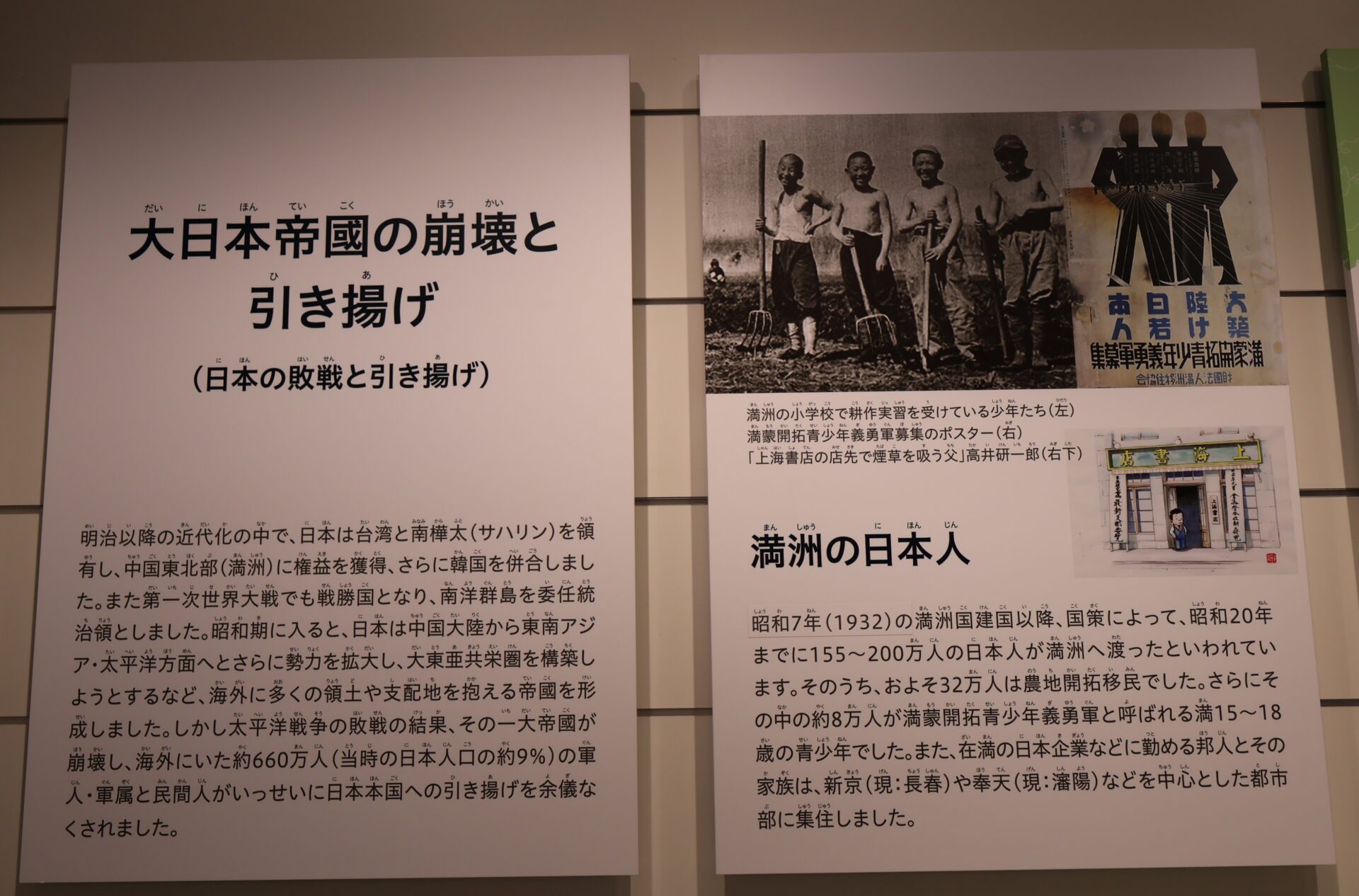 常設展廳分為兩個展區,分別為聚焦日本近代史與引揚背景的「困境的記憶」;以及承載返國歷程與記憶的「回國與重逢」。參觀路線引導觀眾首先進入「困境的記憶」展區,透過牆上的年表、圖文展版及文物,使觀者建立對當時的時代背景,以及「引揚」的基本認識。