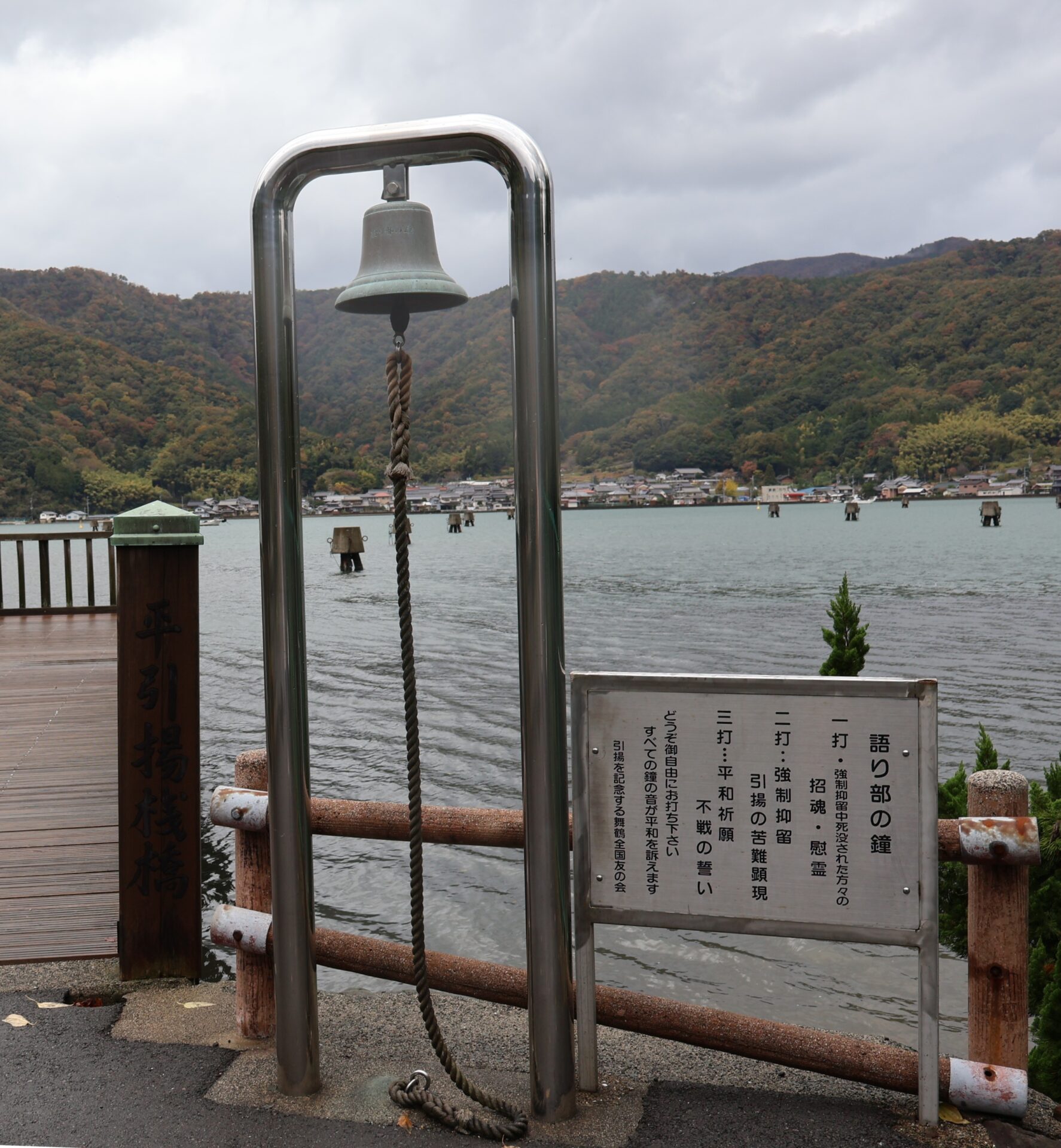 距離紀念館僅數分鐘車程的舞鶴港,至今仍保留當年引揚的重要場址。昔日的「舞鶴引揚援護局」(舞鶴遣返援助局)舊址如今已成為民間工廠,港邊的引揚棧橋及和平鐘經過修復後,開放遊客自由參觀。和平鐘旁立有解說牌,邀請遊客依序敲響和平鐘——第一聲悼念亡者,第二聲銘記苦難,第三聲祈願和平。悠長的鐘聲乘著海風傳回舞鶴引揚紀念館,持續傳遞著對和平未來的展望。