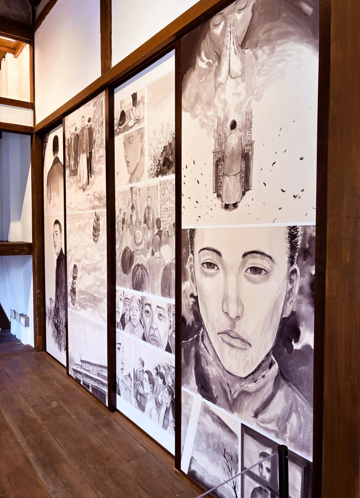 另一方面,漫畫如何回應過去的政治與人權壓迫歷史?漫畫家阮光民以日治時期政治運動家蔡惠如為主角,描繪他因治警事件遭判刑,從家中啟程前往臺中刑務所報到的歷程。這件作品〈意難忘〉創作於事件原址,使漫畫敘事與歷史場域相互呼應,引導觀眾透過圖像認識另一種觀看歷史的方式。