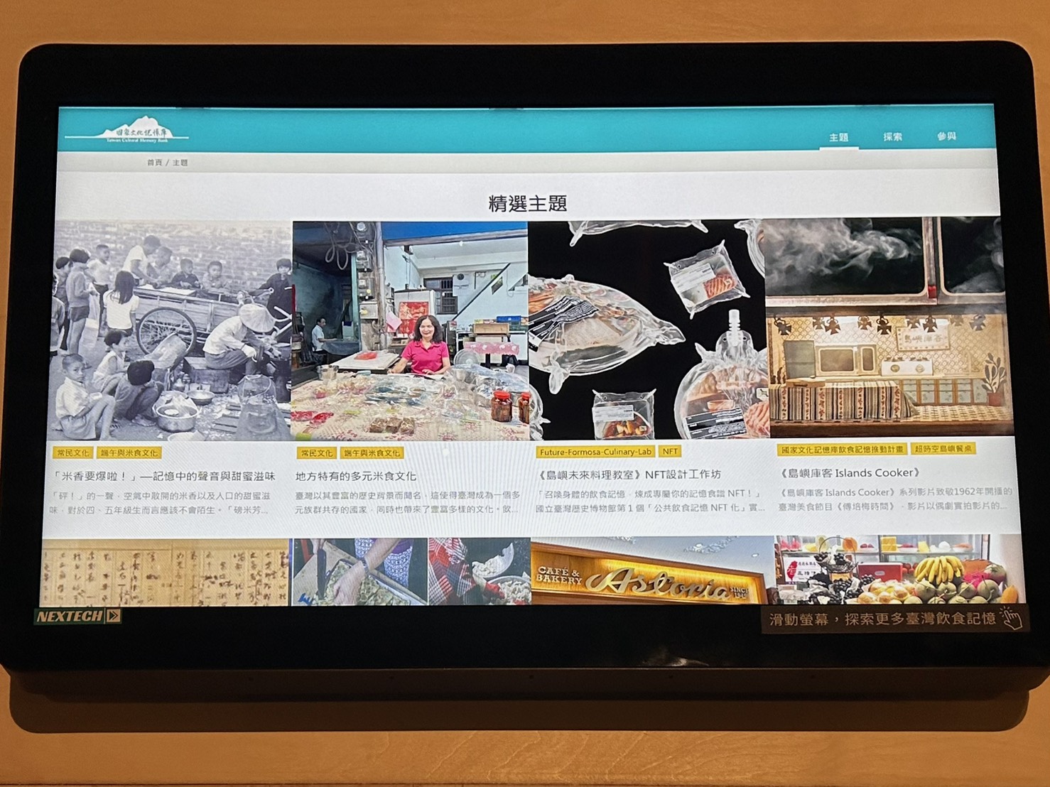 展覽取材自「國家文化記憶庫」由各地方單位、各人所記錄的飲食故事【註釋1】,並從中精選了15組飲食關鍵字,如「雜貨店」、「冰菓室」、「美援麵粉」、「國宴菜」、「民主灶咖」等,重組與轉化不同世代與背景的記憶書寫,再結合臺史博的館藏與媒體裝置,使數位典藏從靜態資料轉化為展場裡具體的敘事與體驗。