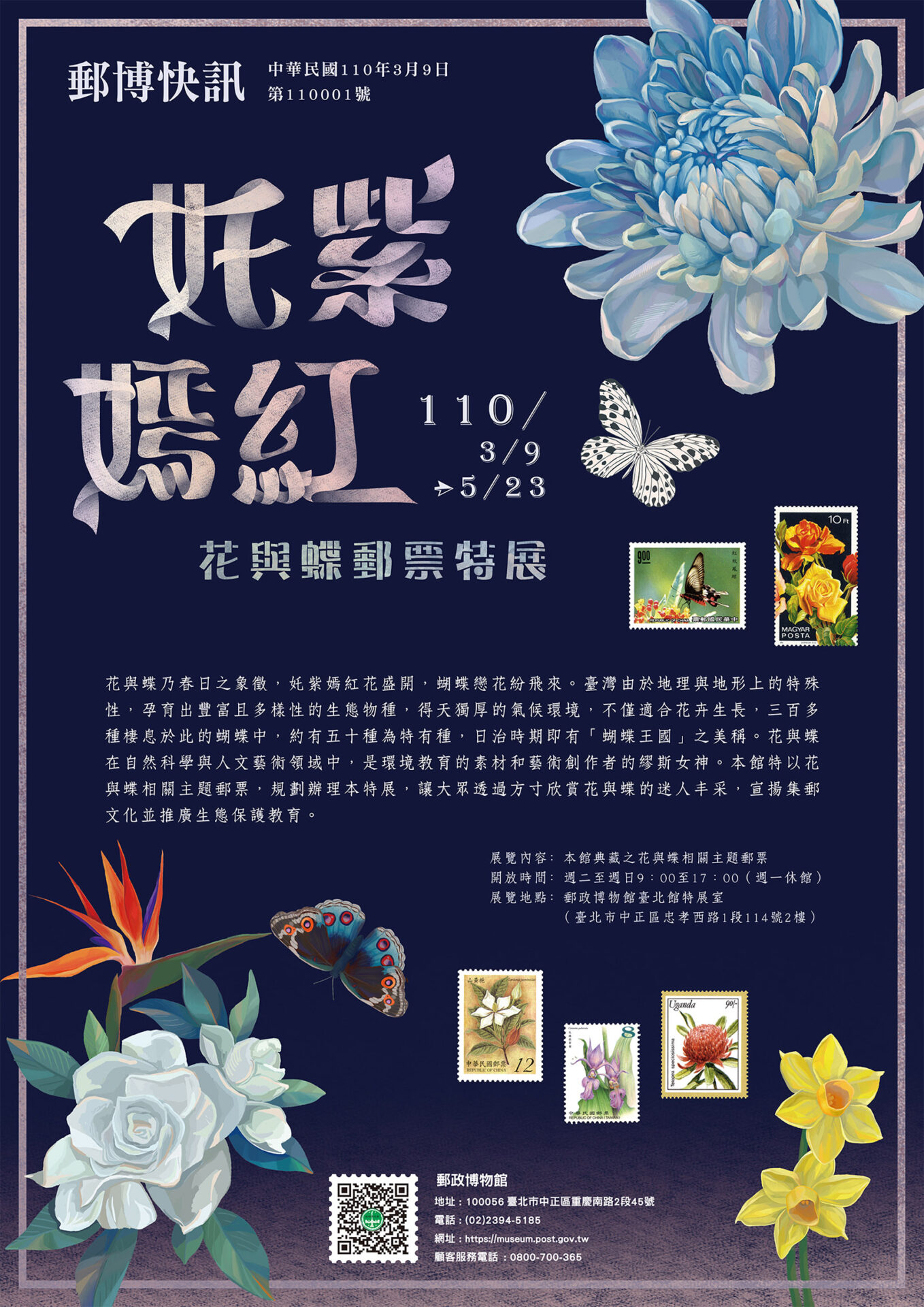 花與蝶乃春日之象徵,奼紫嫣紅花盛開,蝴蝶戀花紛飛來。臺灣由於地理與地形上的特殊性,孕育出豐富且多樣性的生態物種,得天獨厚的氣候環境,不僅適合花卉生長,三百多種棲息於此的蝴蝶中,約有五十種為特有種,日治時期即有「蝴蝶王國」之美稱。花與蝶在自然科學與人文藝術領域中,是環境教育的素材和藝術創作者的繆斯女神。本館特以花與蝶相關主題郵票,規劃辦理本特展,讓大眾透過方寸欣賞花與蝶的迷人丰采,宣揚集郵文化並推廣生態保護教育。