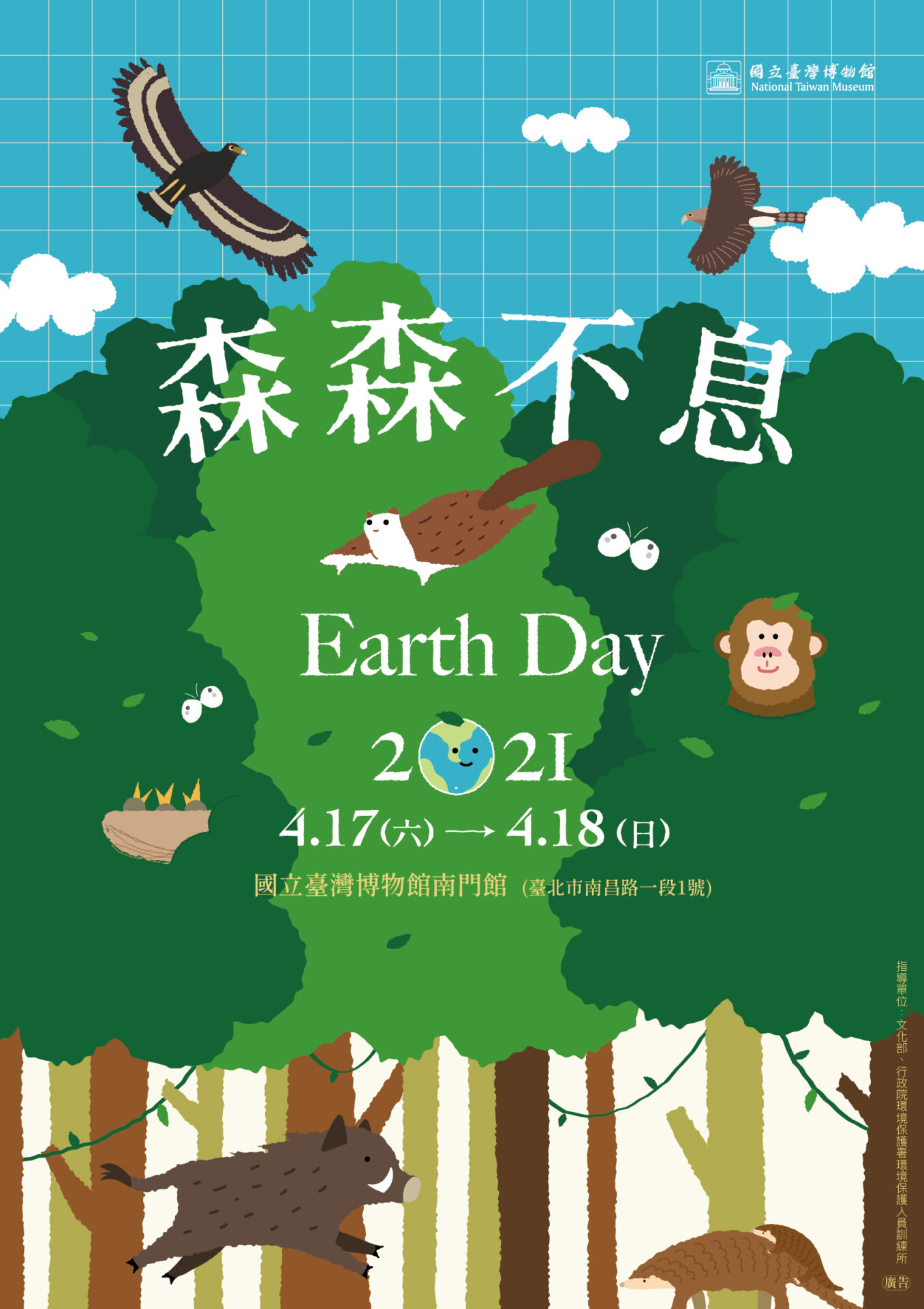 臺博館由修復為基礎概念,以「森森不息」主題響應2021年世界地球日,邀請小農、友善環境工作者、森林保育與療癒相關的NGO及機關團體等,透過「森物課」市集、「森夜電影院」影展、「親森體驗」工作坊、「森林律動派對」等多元形式,推廣人與自然環境關聯性的議題,邀請大家走入愛地球新森活。