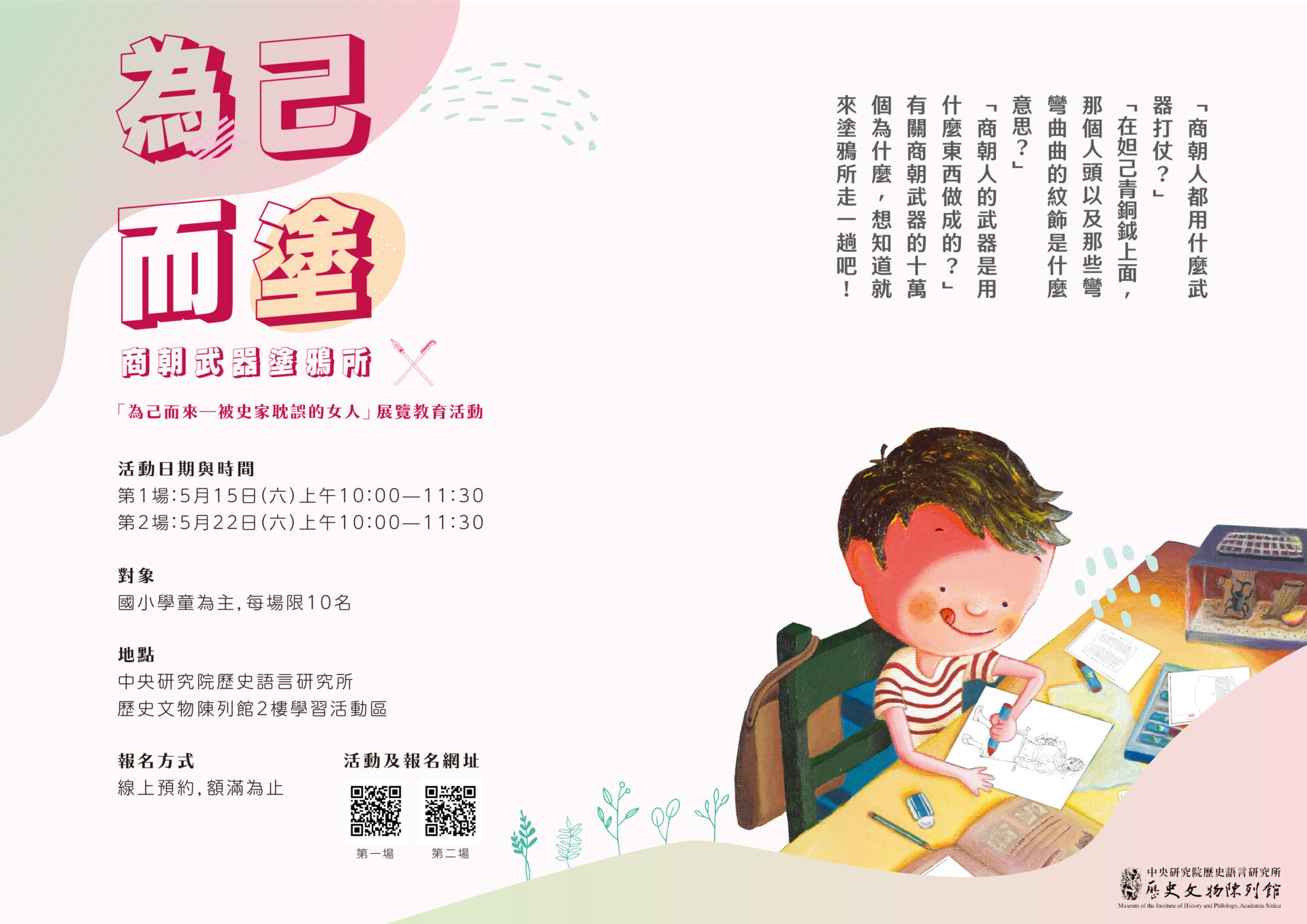 - 備註:本館提供本活動參與者蠟筆與色鉛筆等著色工具,若有額外需求者亦可自備。另參與活動者,每人可以獲得商朝武器塗鴉紙與妲己紙娃娃1套。