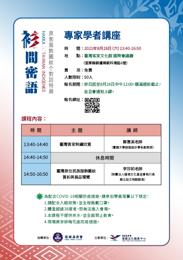 為能更加深入認識本展相關內容,特別舉辦本次講座,邀請到原、客相關領域之專家學者分享所見所學,與您一同深入探討原住民族與客家服飾圖紋之美。