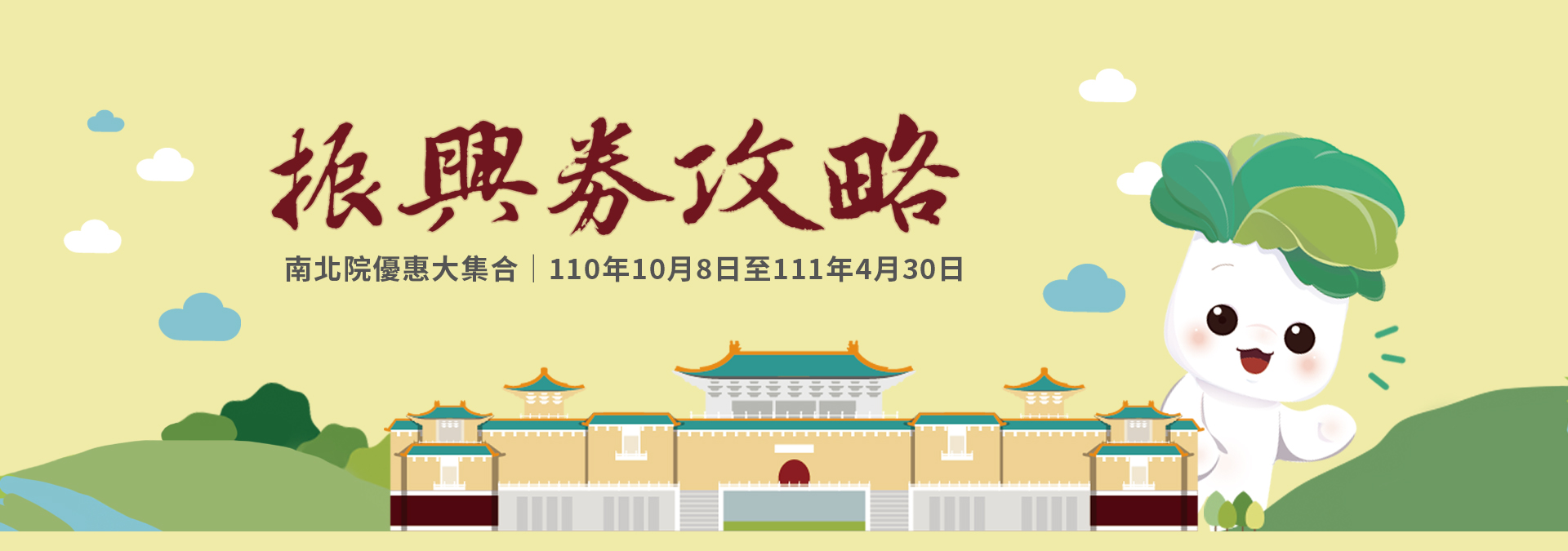 故宮響應振興五倍券,推出「北院優惠參觀券∕南院參觀券+語音導覽機」、「北院優惠參觀券∕南院參觀券+100元抵用券」、「南∕北院假日敬老券2張+100元抵用券」、「北院語音導覽機成人2台或兒童3台∕南院語音導覽機2台」組合優惠價200元,100元抵用券適用於故宮商店(含網路商城)、餐廳、租借語音導覽機消費抵用。