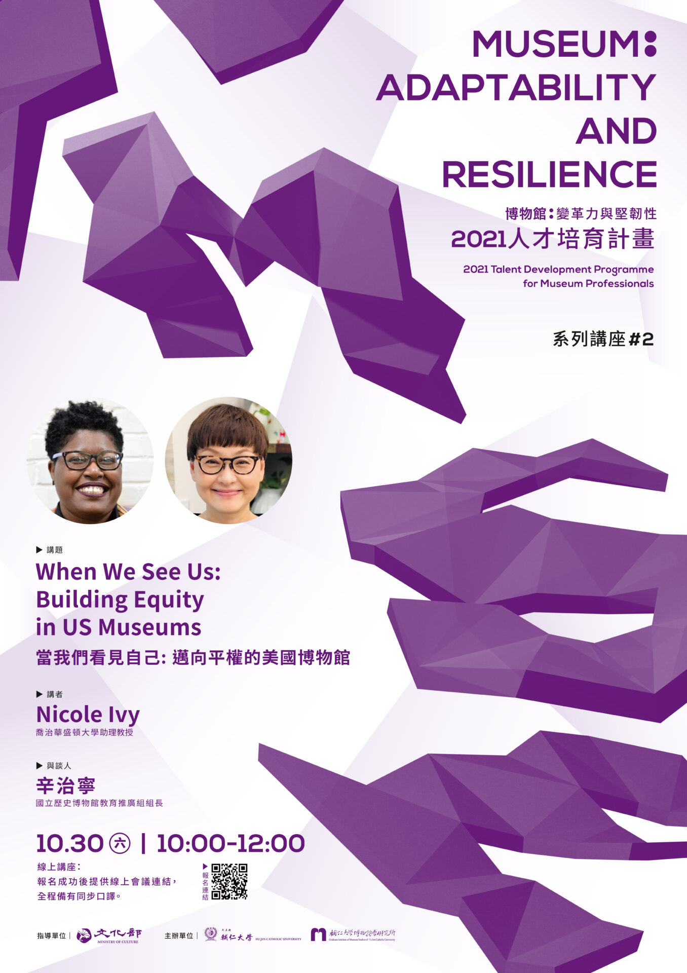 本次第二場講座邀請到現為喬治華盛頓大學的教授Nicole Ivy為我們線上演講,作為前美國博物館聯盟中負責博物館包容力的主任及歷史學家,如何以歷史的角度引導博物館甚至是大學、周遭社區,呼籲及克服所謂的「內在偏見」,以促進社會的包容力?演講也邀請國立歷史博物館教育推廣組組長辛治寧老師在線上座談中回應,一同探討博物館如何回應現今的不平等~!