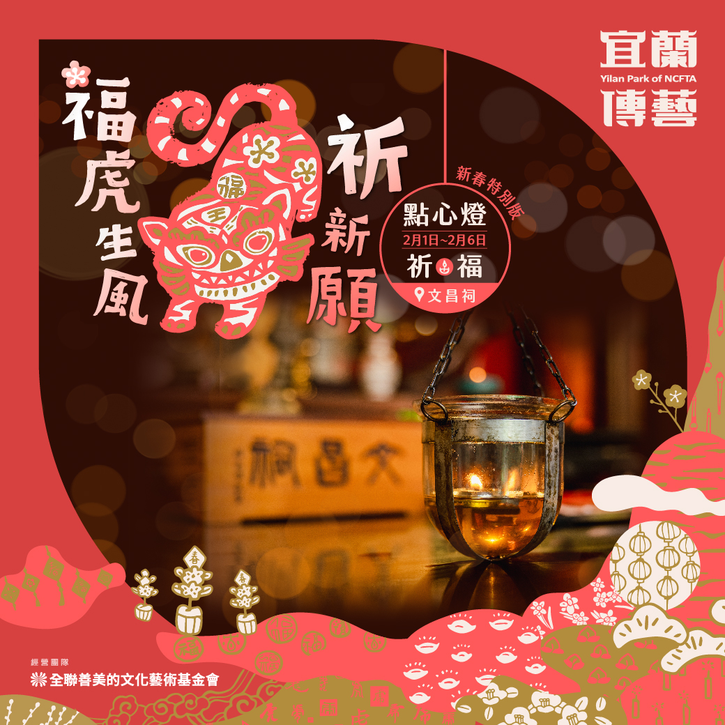 為使更多人深入參與點燈儀式、展現傳統延續之重要性,宜蘭傳藝園區推出新春限定版點心燈組合包,增加新春紅包袋及限量虎年祈福卡(限量發送,送完為止),邀請各位在新年期間共襄盛舉,一同參與點燈,祈福新年新氣象。