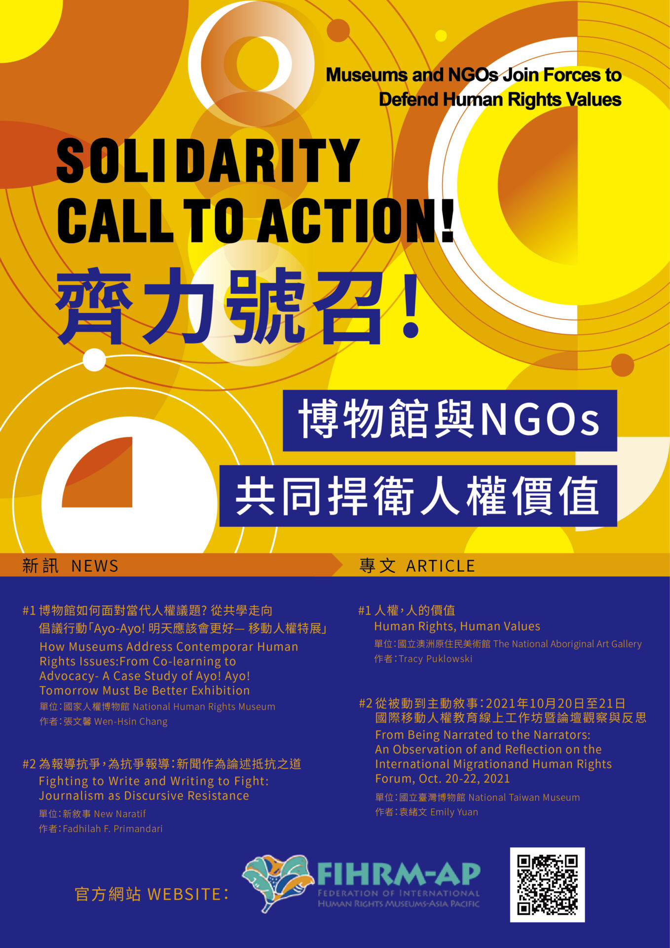 FIHRM-AP官網作為網路傳播媒介與平台,啟動與串聯亞太分會會員間的交流與合作,藉此讓人權價值與理念得以發聲,激盪更多回響與共鳴。今年度將規劃四期新訊與專文,第一期以「齊力號召!博物館與NGO共同捍衛人權價值」為主題收錄四篇文章。